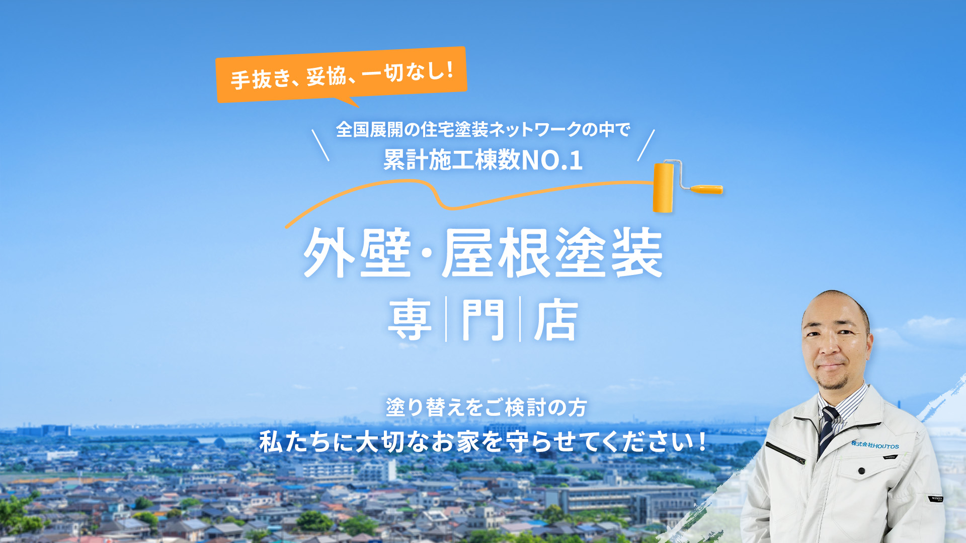 京都府京田辺市、精華町で外壁塗装・屋根塗装をご用命なら、プロタイムズ京田辺店 株式会社HOUTOSへご相談ください。外装劣化診断士による信頼できる建物診断から、工事基準に則った的確な施工、W工事保証とアフターフォローで施工後も安心をお届けいたします。外壁塗り替えから天井のシミ、水漏れ、雨漏りのトラブル対応もお任せください。見積もり、診断無料、お気軽にお問い合わせください。